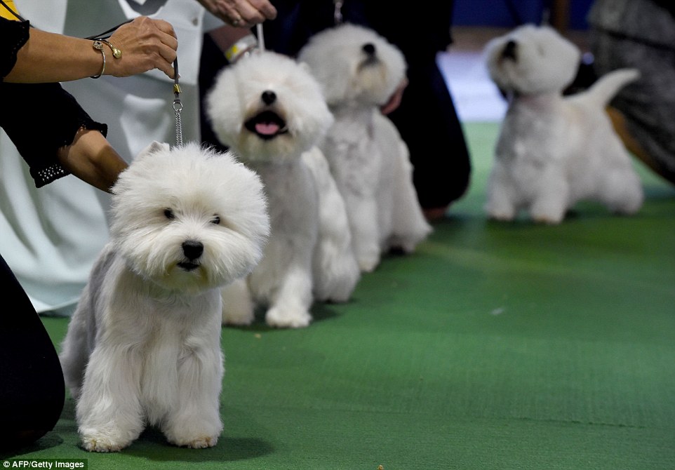 West Highland White Terriers prepare to compete in the 140th Westminster Kennel Club Dog Show