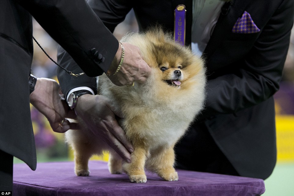 A Pomeranian, which won third place in its category, is inspected by the judge in the ring during the Toy group competition
