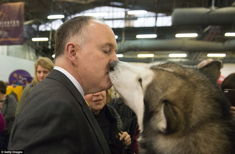 An owner gives his Malamute a kiss in the grooming area on the second day of the 140th annual Westminster Kennel Club Dog Show
