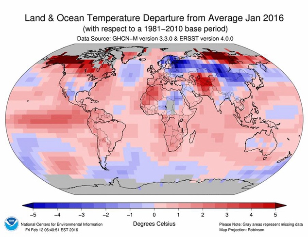 This image shows a map worldwide temperatures for the month of January, 2016. Earth's string of hottest months on record extends to nine straight with last month notching the hottest January