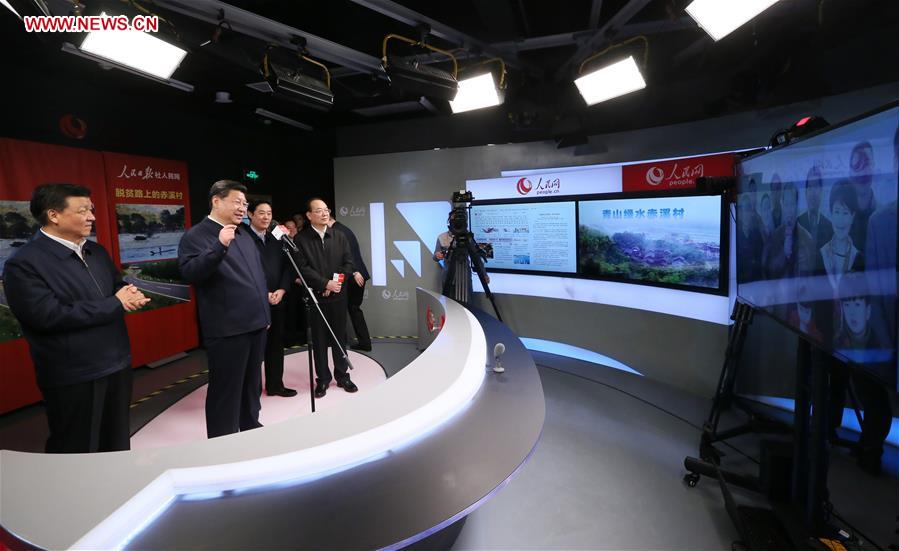 BEIJING, Feb. 19, 2016 -- Chinese President Xi Jinping (2nd L) talks with villagers of Chixi Village in Ningde of southeast China's Fujian Province via videolink while visiting the People's Daily in Beijing, capital of China, on Feb. 19, 2016. Xi on Friday visited the People's Daily, Xinhua News Agency and China Central Television, the nation's three leading news providers. (Xinhua/Lan Hongguang)