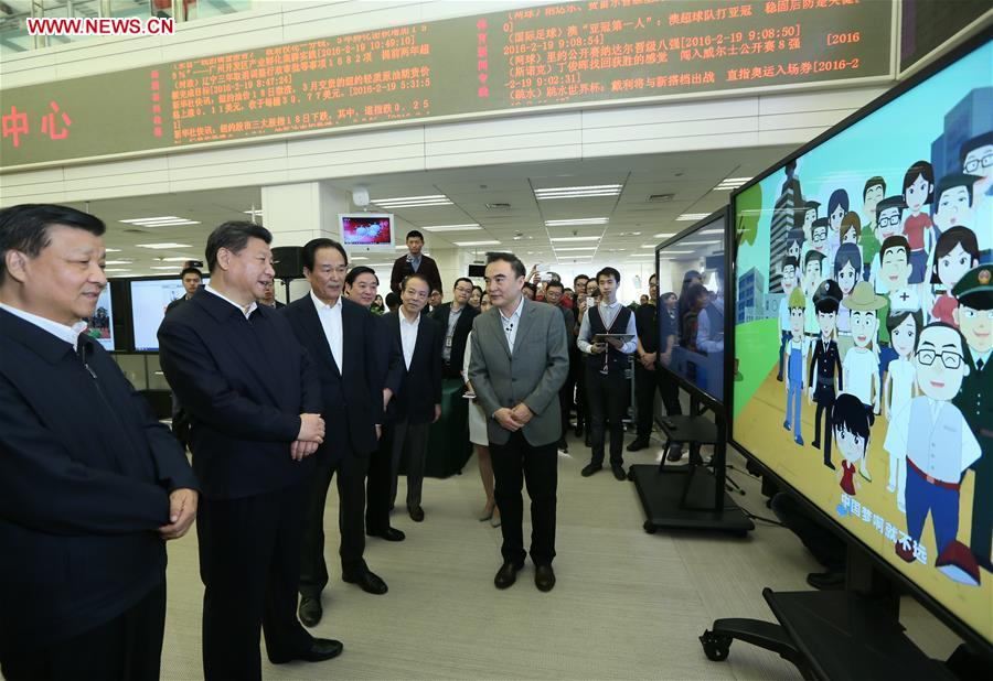 BEIJING, Feb. 19, 2016 -- Chinese PresidentXi Jinping(2nd L, front) watches a video at the headquarters of Xinhua News Agency in Beijing, capital of China, on Feb. 19, 2016. Xi on Friday visited the People's Daily, Xinhua News Agency and China Central Television, the nation's three leading news providers. (Xinhua/Lan Hongguang)