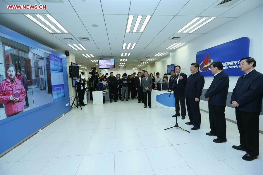 BEIJING, Feb. 19, 2016 -- Chinese President Xi Jinping (3rd R) uses a remote news reporting command system to talk with a correspondent currently reporting from a village in Lankao County of Henan Province, at the headquarters of Xinhua News Agency in Beijing, capital of China, on Feb. 19, 2016. Xi on Friday visited the People's Daily, Xinhua News Agency and China Central Television, the nation's three leading news providers. (Xinhua/Lan Hongguang)