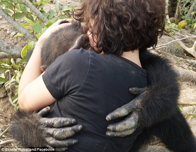 The chimp immediately embraced Estelle in a huge hug and laughed as she reached out for him, his smile from ear to ear.