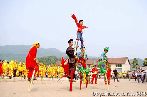 In Donggong Town and even in the entire Nanzhang County, it has become a tradition to invite a stilts dance team to give a big performance whenever a store opens or a wedding ceremony is held, with a view to making the event more joyful and whatever will come of it more successful.