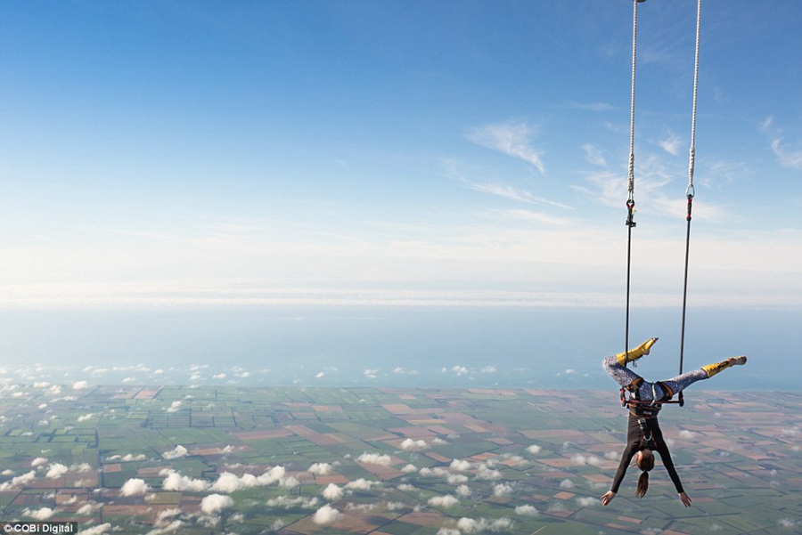 On the trapeze, suspended upside down at more than 10,000ft in the air, Ms Cochrane completed a routine for more than five minutes