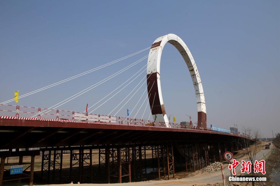 A new bridge with a huge white ring is built in a road in Zhengzhou, central China's Henan province. This huge ring which looks like a ferris wheel turns out to be a tower of a cable-strayed bridge. The bridge, 225 meters long and 32 meters wide, will be completed recently. (CNS/Wang Zhongju)
