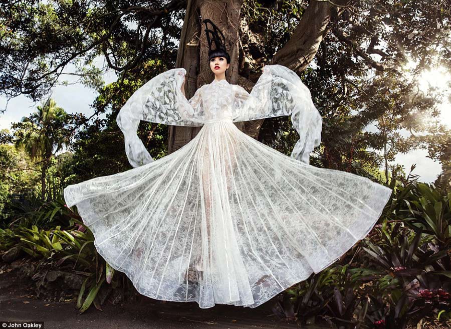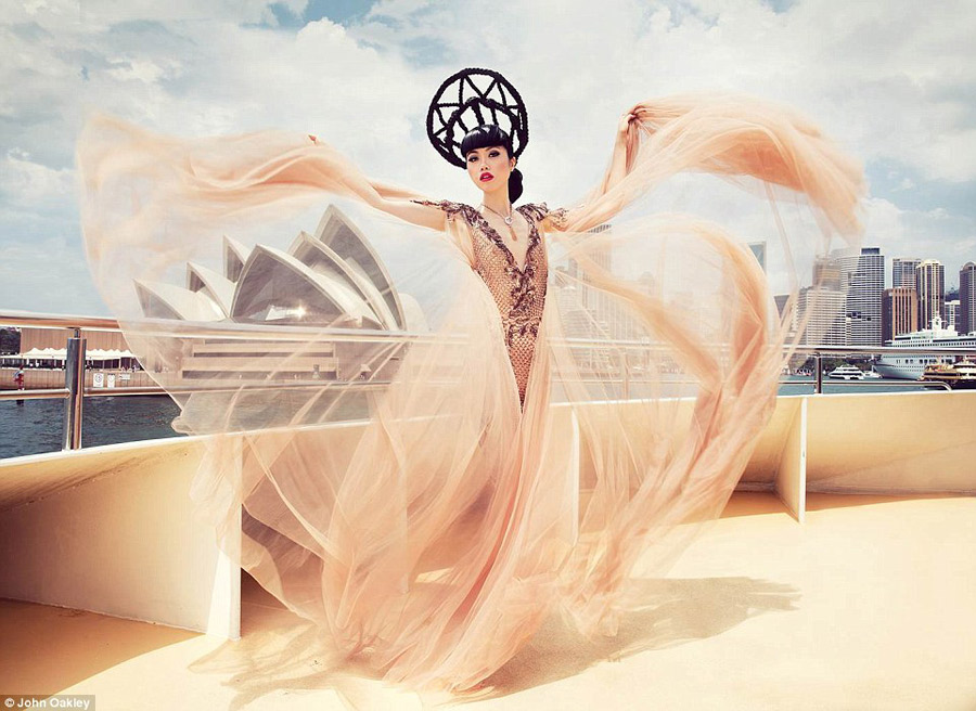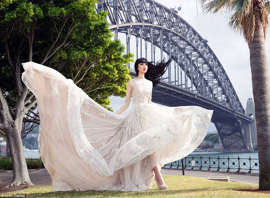 The stunning model has posed in billowing dresses beside Sydney Harbour and in Sydney's Royal Botanic Gardens, combining fashion with nature, architecture and culture.