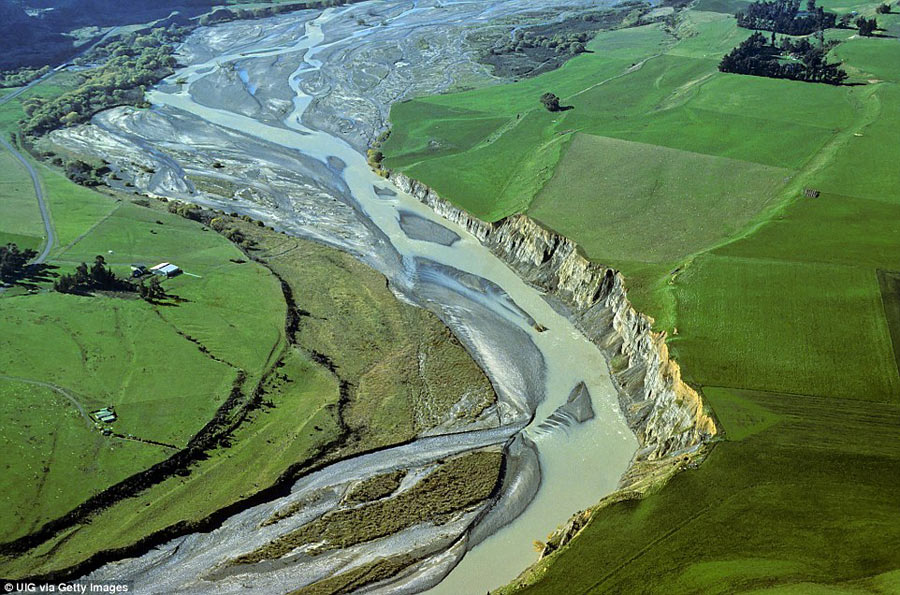 Erosion shapes the path of the Awatere River in Marlborough, New Zealand, creating beautiful patterns when captured from above.