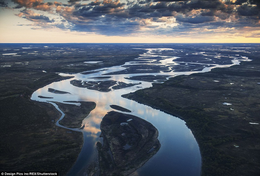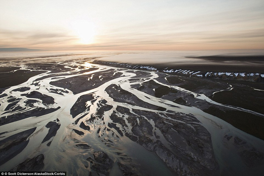 Silver braids of glacial silt are illuminated by the sun on the Canning River which traces the western boundary of the Arctic National Wildlife Refuge's coastal plain in the US.