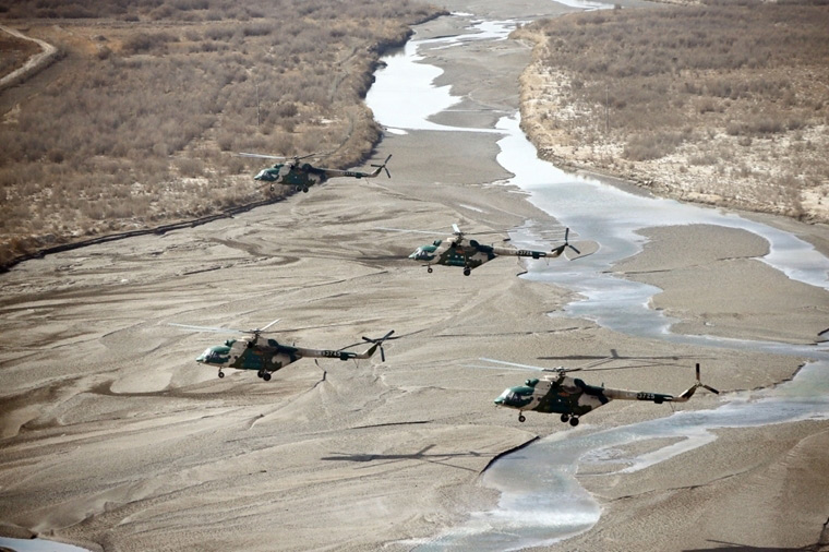 Four Mi-17 helicopters fly over a river in the Kunlun Mountains. A PLA army aviation brigade stationed in Xinjiang organized its troops to conduct realistic flight training on such subjects as performing emergency operations, attacking armored troops, providing close range fire support, conducting in-depth air-landed operations and so forth in the Kunlun Mountains, southwestern Xinjiang Uygur Autonomous Region, China, on March 2, 2016.(Photo/www.81.cn)