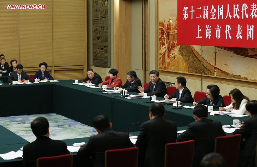 Chinese President Xi Jinping joins a group deliberation of deputies from Shanghai to the annual session of the National People's Congress in Beijing, capital of China, March 5, 2016.
