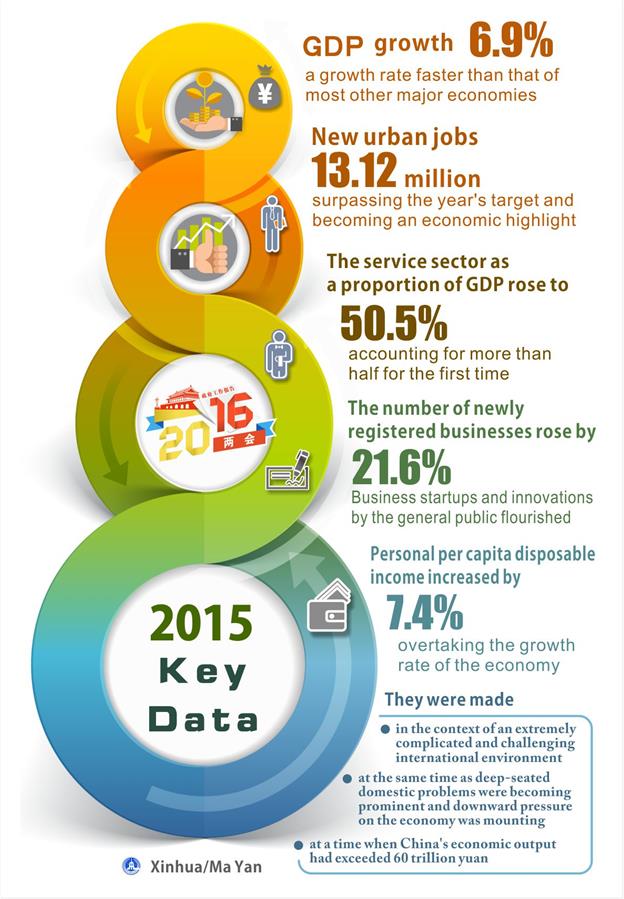 Graphics shows key data of 2015 written in the government work report at the 2016 annual session of China's National People's Congress. (Xinhua/Ma Yan)
