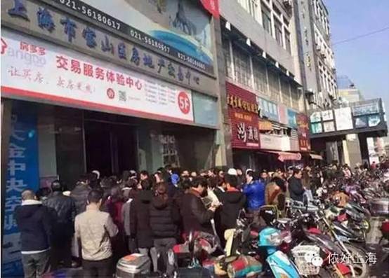 The photo, posted online by netizens, was taken on people in queue in front of an estate trading center in Shanghai after Spring Festival. (Photo: Wechat account named “Hello, Shanghai” )