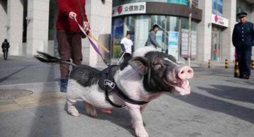 "I saw a woman walking her pet pig in the the Zhongguancun West region yesterday morning. The pig was larger than a big dog. It had a black head, tail and back. The woman had to drag the pig to move it forward, maybe because it did not feel comfortable with a leash tied to its forelegs," said the man who posted the photos online.