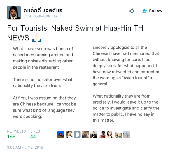 "I would like to apologize to China for accusing your tourists of stripping on Hua Hin Beach Saturday," he wrote.