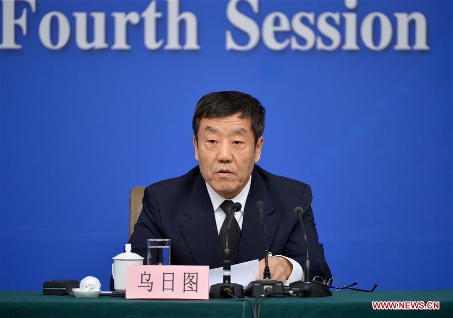 Deputy Director of the National People's Congress (NPC) Finance and Economic Committee Uzhitu answers questions during a press conference about legislation progress on the sidelines of the fourth session of China's 12th NPC in Beijing, capital of China, March 10, 2016. (Xinhua/Li Xin)