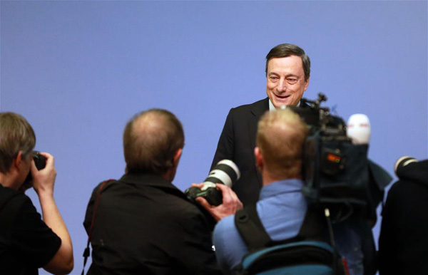 European Central Bank (ECB) President Mario Draghi (rear) attends a press conference at the ECB headquarters in Frankfurt, Germany, on March 10, 2016. The Governing Council of the ECB decided to cut the main refinancing operations rate for the euro area by 5 basis points to record low of zero percent on Thursday. [Photo: Xinhua]