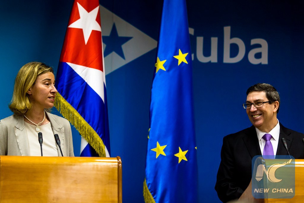 Cuban Foreign Minister Bruno Rodriguez (R) and EU foreign policy chief Federica Mogherini attend a joint press conference in Havana, capital of Cuba, March 11, 2016. (Xinhua/Liu Bin)
