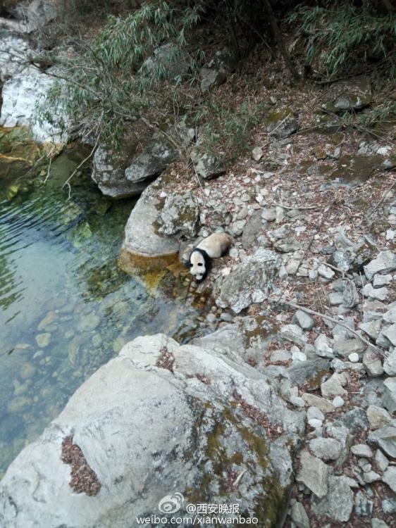 The photo taken by a local villager shows a wild giant panda drinking water by a river. As spring comes, wild giant pandas have become active. On March 9, the wild giant panda was spotted drinking water by a river at Daguping village, Foping county in northwestern China's Shaanxi province. Local villager He Yijun recorded this with its mobile phone.