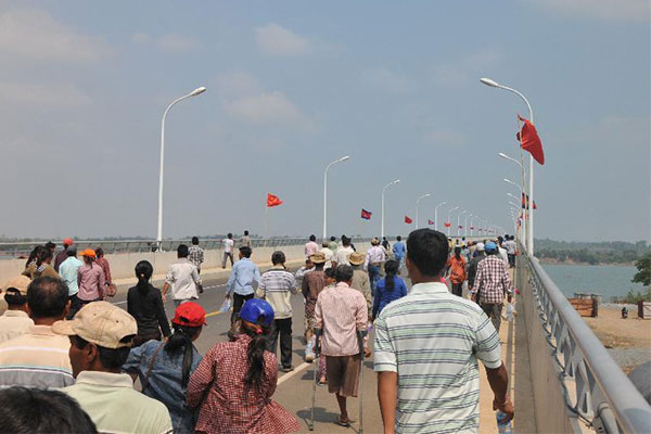 People walk on the Mekong River bridge in Stung Treng province, Cambodia, April 1, 2015. [Photo: Xinhua]