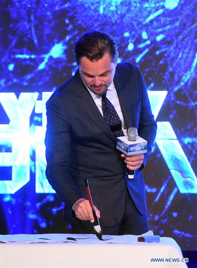 U.S. actor Leonardo DiCaprio (R) poses for photo with the calligraphy work written by himself during a promotion activity for his movie "The Revenant" in Beijing, capital of China, March 20, 2016. Oscar-winning epic "The Revenant" has been put on the screen in China since March 18.