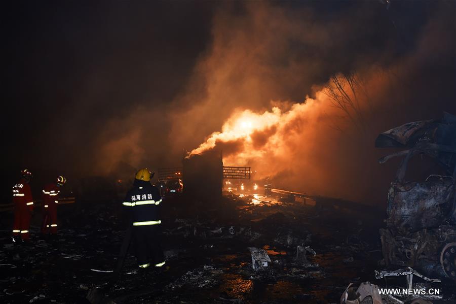 Fire fighters work at the explosion site on a section of the highway linking Beijing to Hong Kong and Macao, in Yueyang City, central China's Hunan Province, March 20, 2016. Five people died and twenty others were injured after a truck exploded on the highway on Saturday, according to local authorities. [Photo: Xinhua/Li Ga]