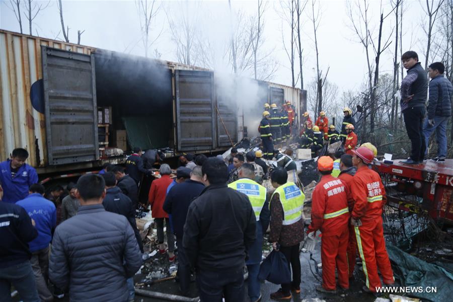 Photo taken on March 20, 2016 shows the explosion site on a section of the highway linking Beijing to Hong Kong and Macao, in Yueyang City, central China's Hunan Province. Five people died and twenty others were injured after a truck exploded on the highway on Saturday, according to local authorities. [Photo: Xinhua/Zhou Min]