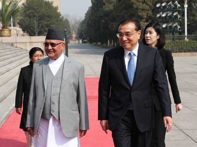 BEIJING, March 21, 2016 -- Chinese Premier Li Keqiang (C) meets with Nepalese Prime Minister K. P. Oli (L) in Beijing, capital of China, March 21, 2016. (Xinhua/Pang Xinglei)