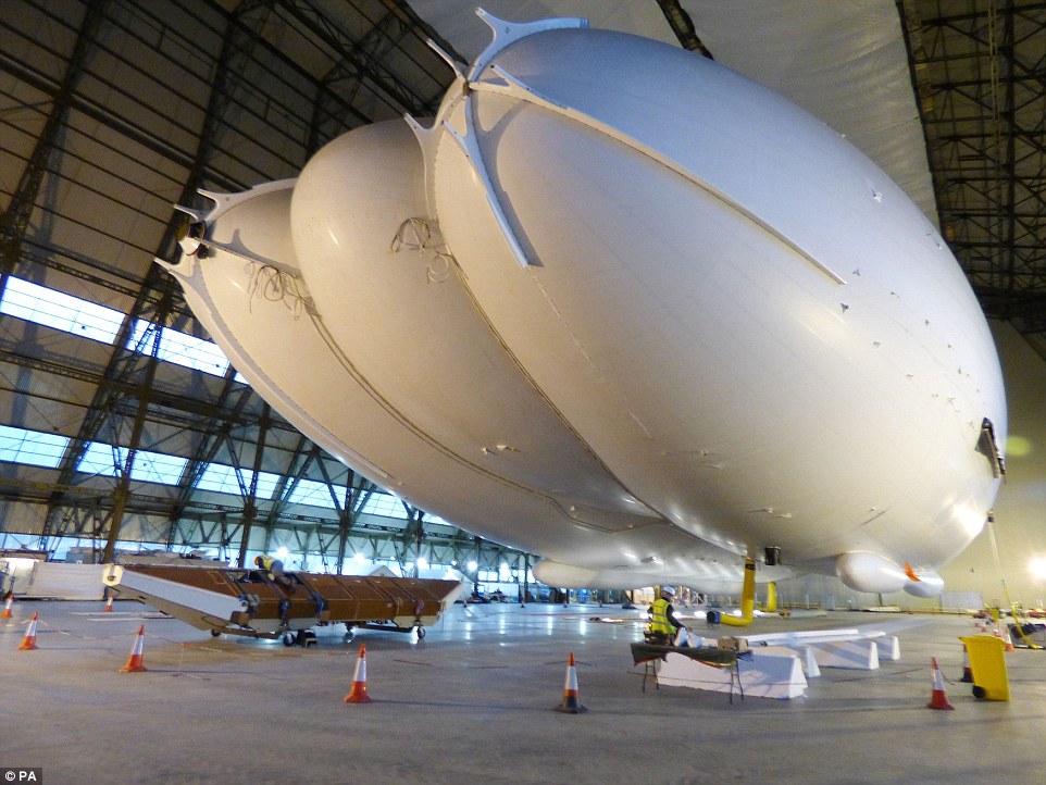 During last year's 'floating' test, the craft was attached to four fork-lift trucks, each with a two-tonne block of cement to stop it being carried away, and driven the entire length of the hangar. It has been three years since work began on the Airlander 10 (pictured)
