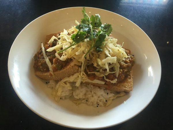 1. Put the hot fried slices of tofu on the hot steamed rice, put the spicy tomato sauce on top, followed by stir-fry cabbage.