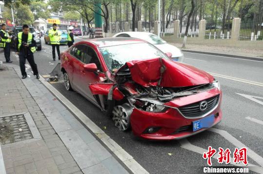 At 6 a.m., Yichang police center received a call saying a red Mazda sedan with tires on the right side missing was running on the road. The center immediately ordered the nearby police officers to find the car's location and intercept it. At 6:05 a.m., a police officer found a red damaged Mazda sedan stopped at the roadside after knocking down a sanitation truck.