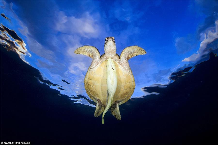 Greg Lecoeur, who took this image, said: 'The French Polynesia is an amazing place for nature lovers. In the lagoon of Moorea I was snorkeling with an abundance of marine life, most notably these black tip sharks. The topography of the mountains in the background inspired me to release this half and half photo'