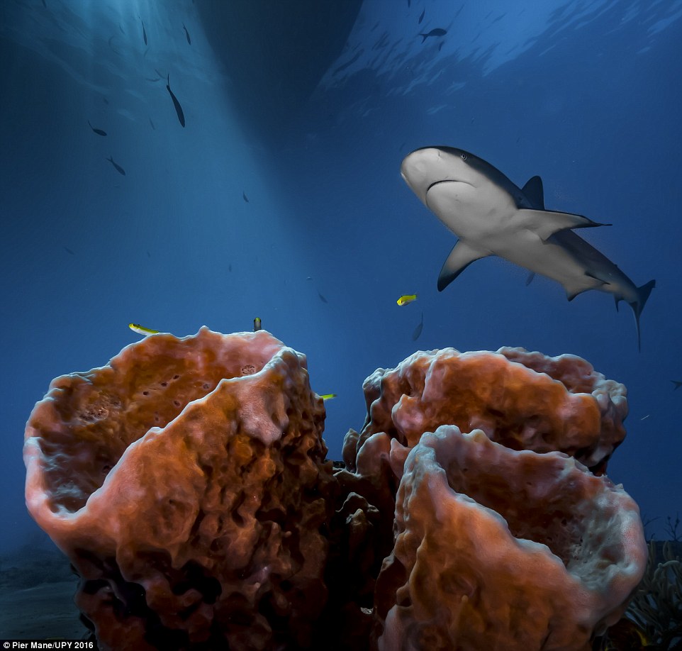 South African photographer Pier Mane took this image after deciding to 'turn away from the action'. He said: 'Weary of shooting sharks head-on, and keen to avoid bubbles in my shot, I decided to turn away from the peak action and the crowds it attracts. I wanted sun rays, dramatic foreground, background perspective, and - the cherry on top - to capture the 'master of the house' in all of its mystique. The three sponges were well-positioned to set the scene beneath the boat and it took countless shots to balance the elements I wanted, but perseverance, patience and practice all paid off'