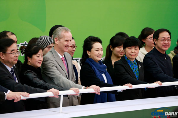 Peng Liyuan (C), China's first lady and the World Health Organization's goodwill ambassador for tuberculosis and HIV/AIDS, takes part in an event to raise awareness about tuberculosis and HIV/AIDS, in Beijing on March 21, 2014. [Photo by Feng Yongbin/China Daily]