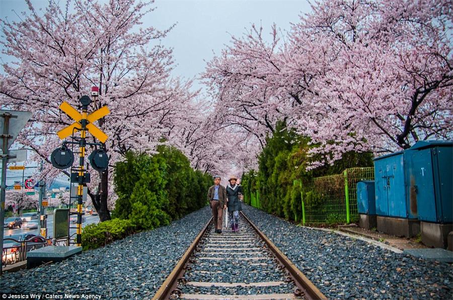 Two locals walk on a rail tracks under the blossom in Jinhae. The pink flowers contrast sharply with the green of the bushes below