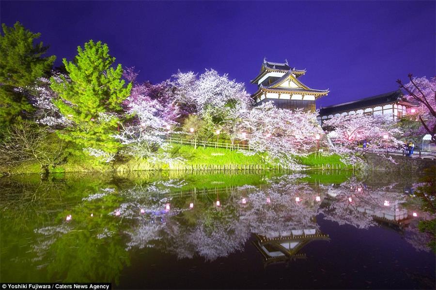 In the Nara prefecture, Japan, the incredible blossoms, illuminated by lights in the night, are reflected back in the still waters below