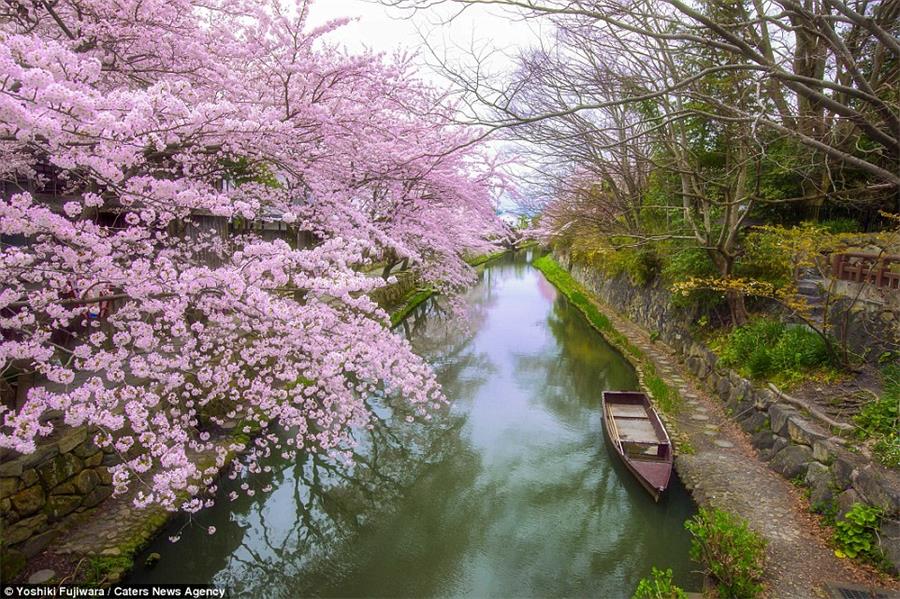 Beside a canal in the Shiga Prefecture, Japan, the branches of the cherry trees are weighed down by the heavy flowers they carry
