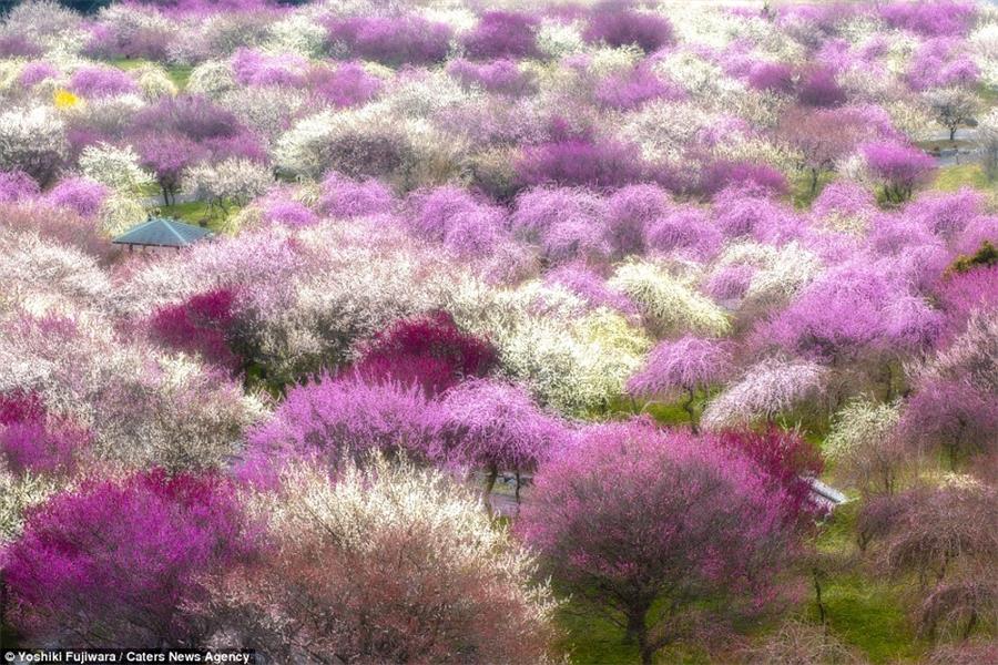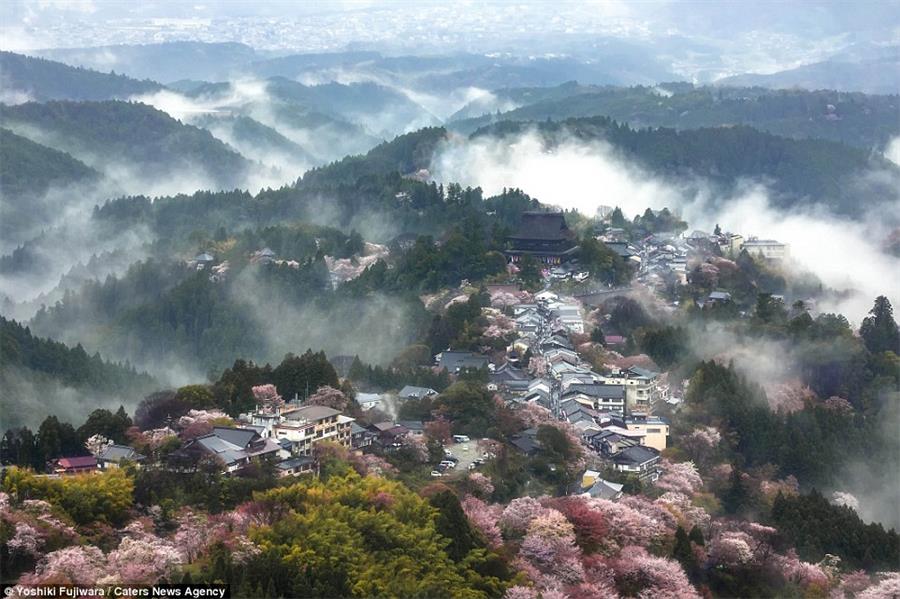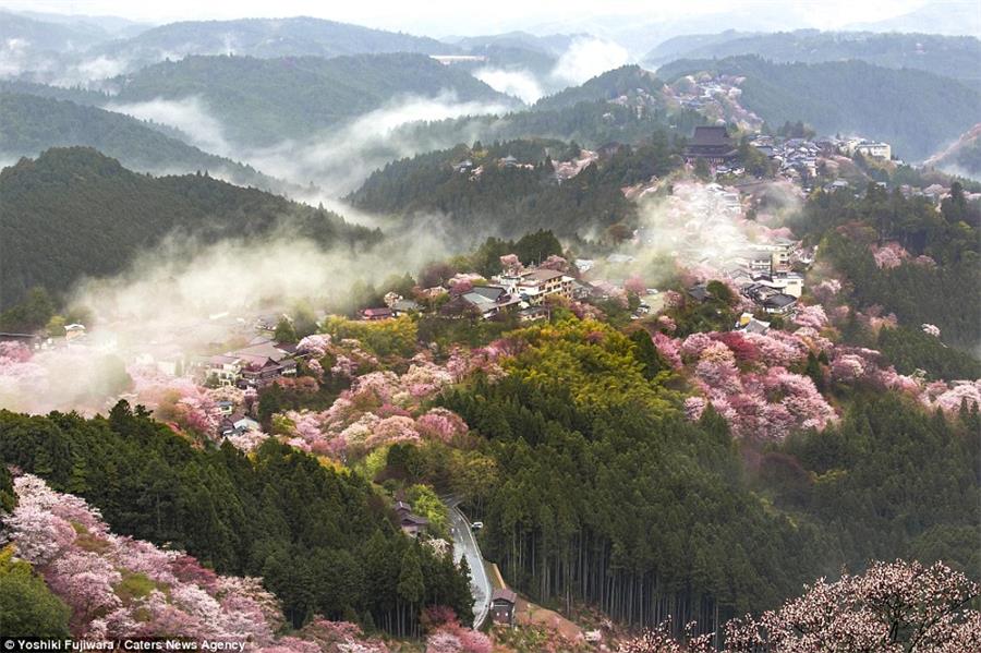 Another shot taken in the Nara Prefecture, Japan, shows cherry trees in bloom amongst the forest green of the other trees around it