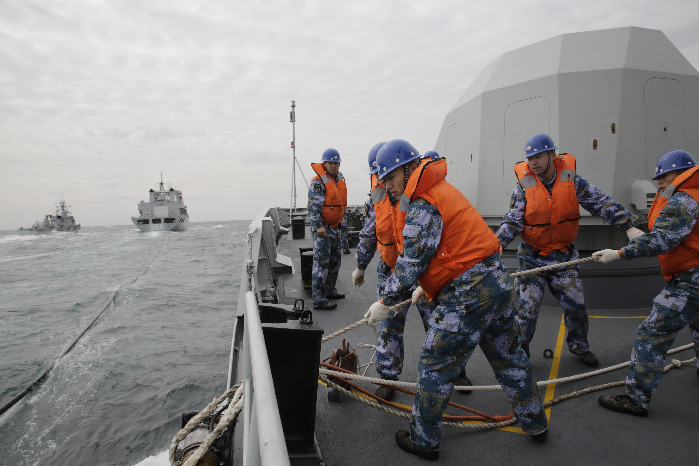 Sailors aboard the guided-missile frigate Quanzhou prepare for a replenishment-at-sea with the comprehensive supply ship Gaoyouhu. A taskforce with a maritime garrison command of the East China Sea Fleet under the PLA Navy, composed of the guided-missile frigates Quanzhou, Shangrao and Foshan and the comprehensive supply ship Gaoyouhu, carried out a sea and air defensive and offensive training exercise in the East China Sea in mid to end of March, 2016. During the exercise, the taskforce rehearsed such training subjects as live-fire shooting at maritime targets, smoke shells launching, anti-submarine warfare, replenishment-at-sea and so forth.(Photo/www.81.cn)