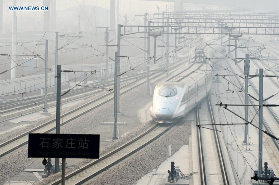 A bullet train arrives at Shijiazhuang Railway Station, north China's Hebei Province, Jan. 10, 2016.