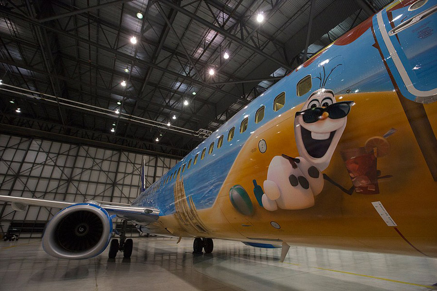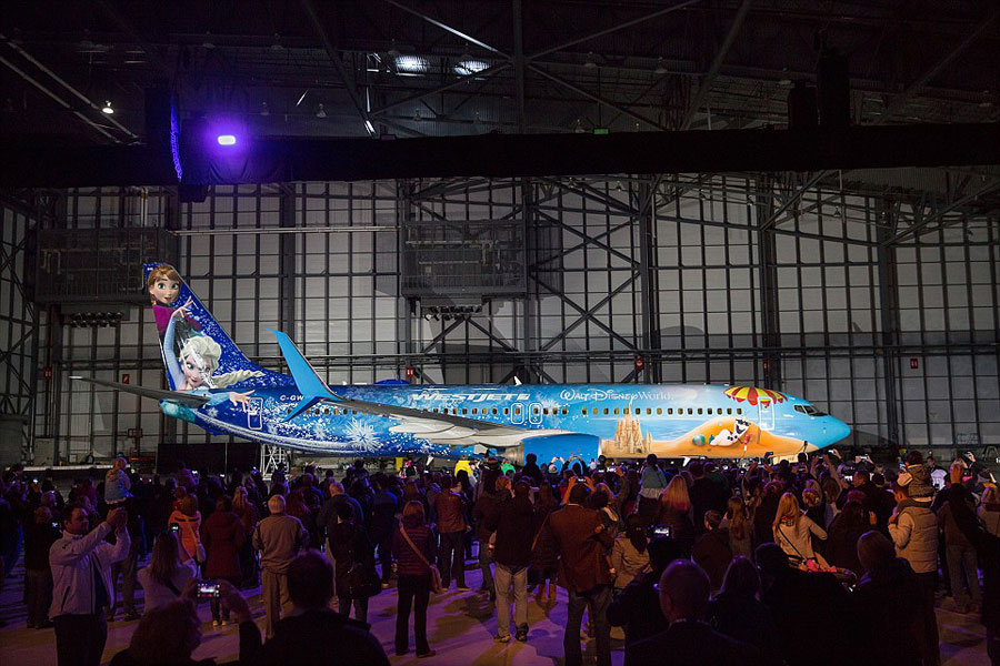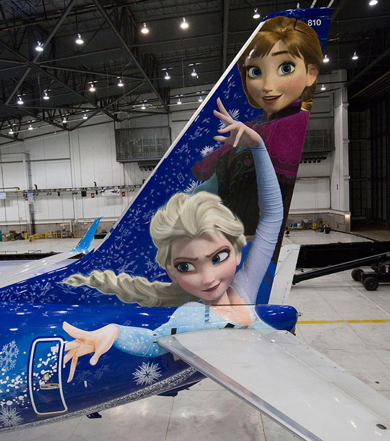 More than 170 gallons of paint were used to create this Frozen-themed livery on a Boeing 737 for Canadian airline WestJet.