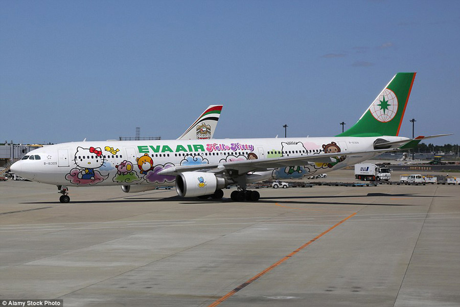 Taiwan's EVA Air has several liveries featuring Hello Kitty. This Airbus A330 flies between Taipei and Manila, Seoul and Hong Kong.