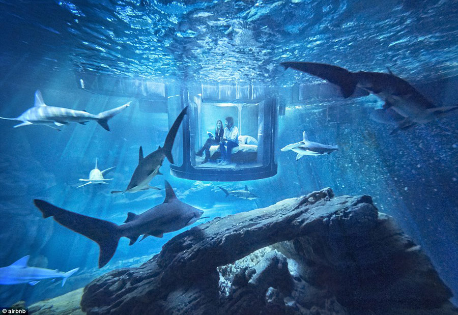 The bedroom is submerged 10 metres underwater and will be surrounded by 35 sharks and tropical fish.