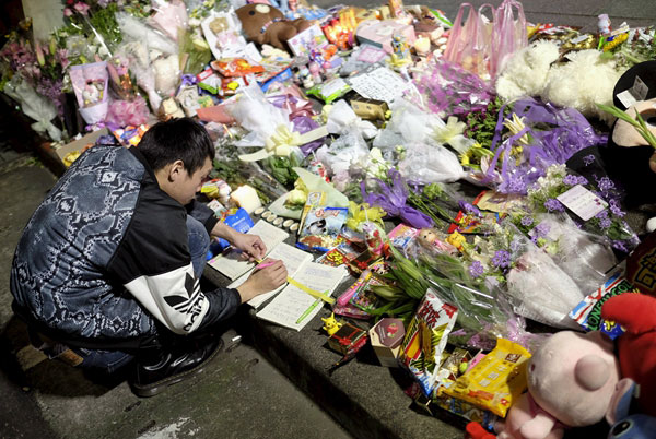 A man leaves a message in a book of condolences at a makeshift memorial near the spot where a 4-year-old girl was killed in Taipei, Taiwan, on Monday. [TYRONE SIU/REUTERS]