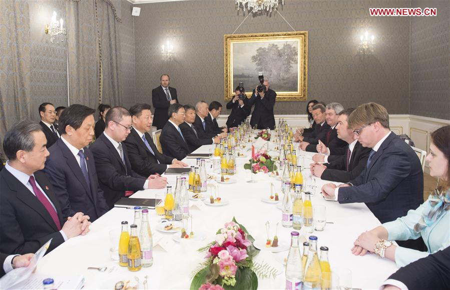 PRAGUE, March 29, 2016 -- Chinese President Xi Jinping (4th L) meets with Jan Hamacek (3rd R), chairman of the Chamber of Deputies of the Czech Parliament, in Prague, the Czech Republic, March 29, 2016. (Xinhua/Wang Ye)