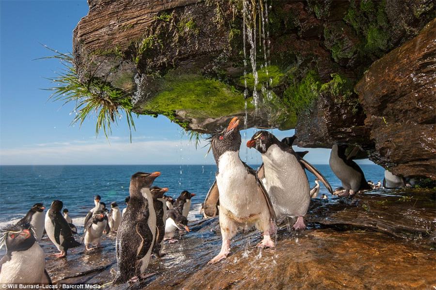 Rockhopper penguins taking a cool shower under the water running from the rocks, taken in the Falkland Islands in December 2009