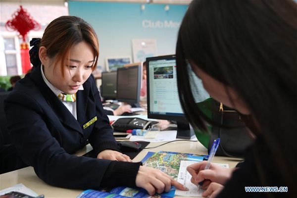 A working staff helps a customer fill in a ticket purchase form of Shanghai Disney Resort in east China's Shanghai, March 28, 2016. Shanghai Disney Resort will officially open and welcome its first guests on June 16. Tickets went on sale on March 28. (Xinhua/Ren Long) |
