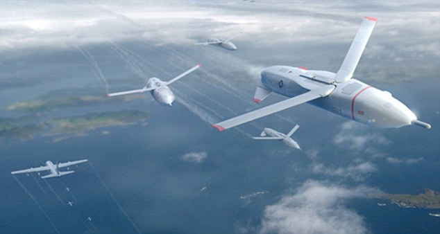 It said: 'As part of a future concept of operations, it is envisioned that instead of using conventional, monolithic systems to conduct missions in denied environments, multiple platforms with coordinated and distributed warfighting functions can be employed to saturate adversary defenses while achieving mission objectives.