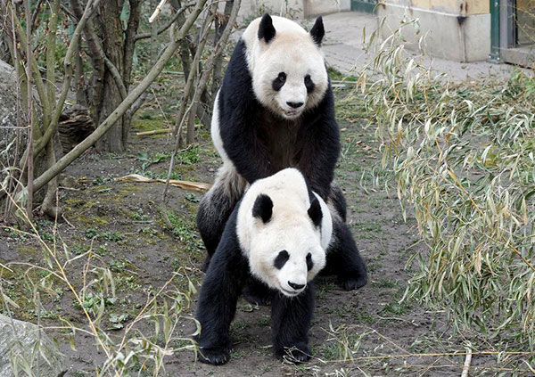Two giant pandas mate in the zoo of Schoenbrunn in Vienna, Austria, March 23, 2016. [Photo/Agencies]